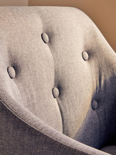 The swivel chair has a tufted grey upholstery and a comfortable seat supported by a black base. It has semi curved arms and a graceful design which complements a variety of interior styles.
