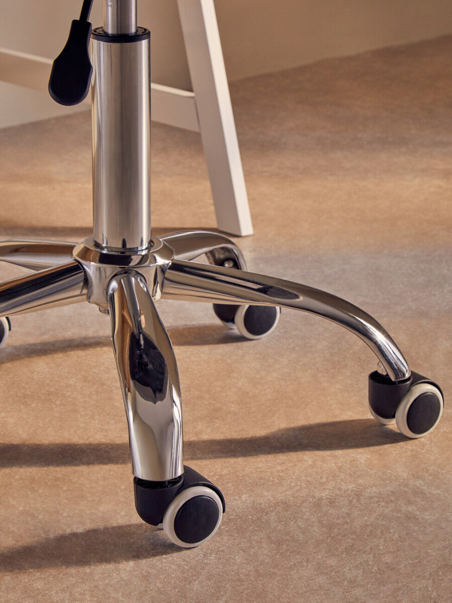 This grey velvet office chair features a curved ergonomic seat with decorative quilted detail. The plush velvet seat with triangular texture rests above a swivel base with hooded castor wheels offering swift manoeuvrability.