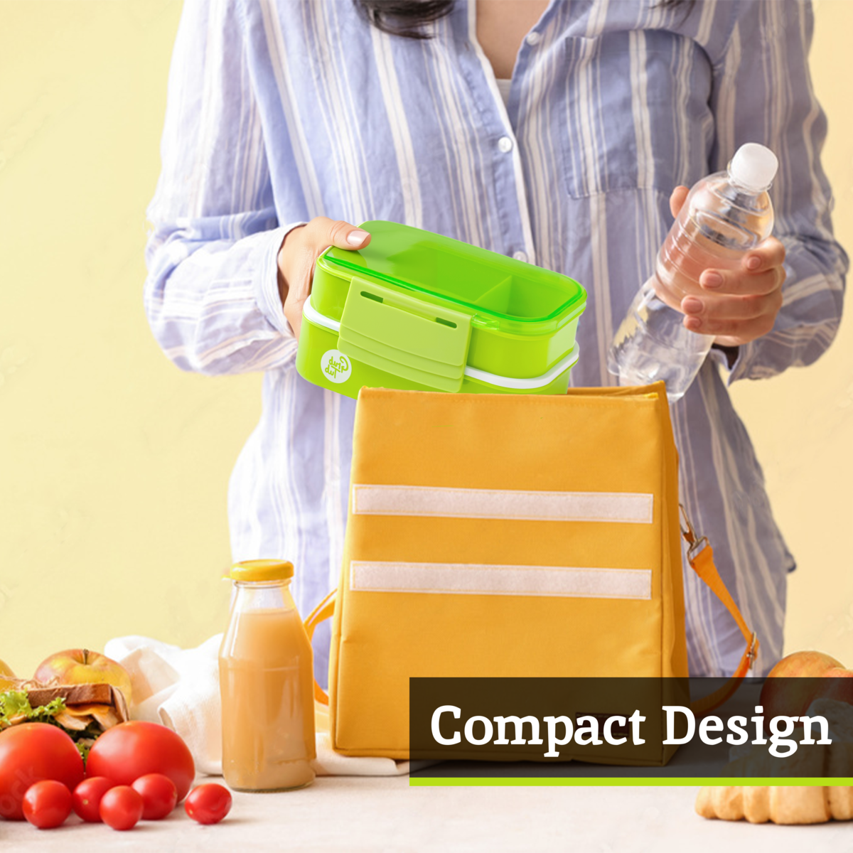- Green lunch box with secure clips for compact, tidy carrying.