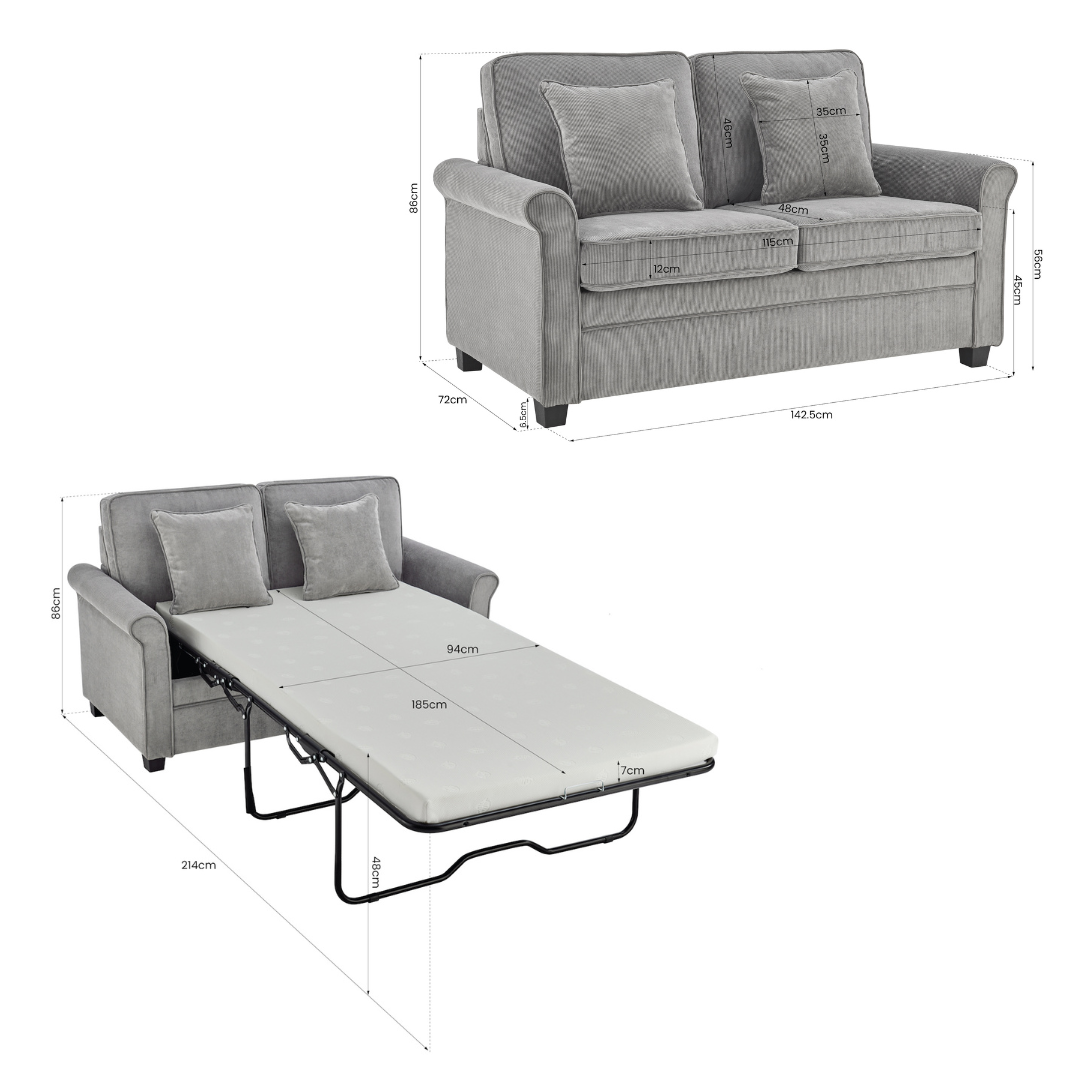 Sofa Bed Corduroy 2 Seater Fold Out Mattress - Ramy Grey