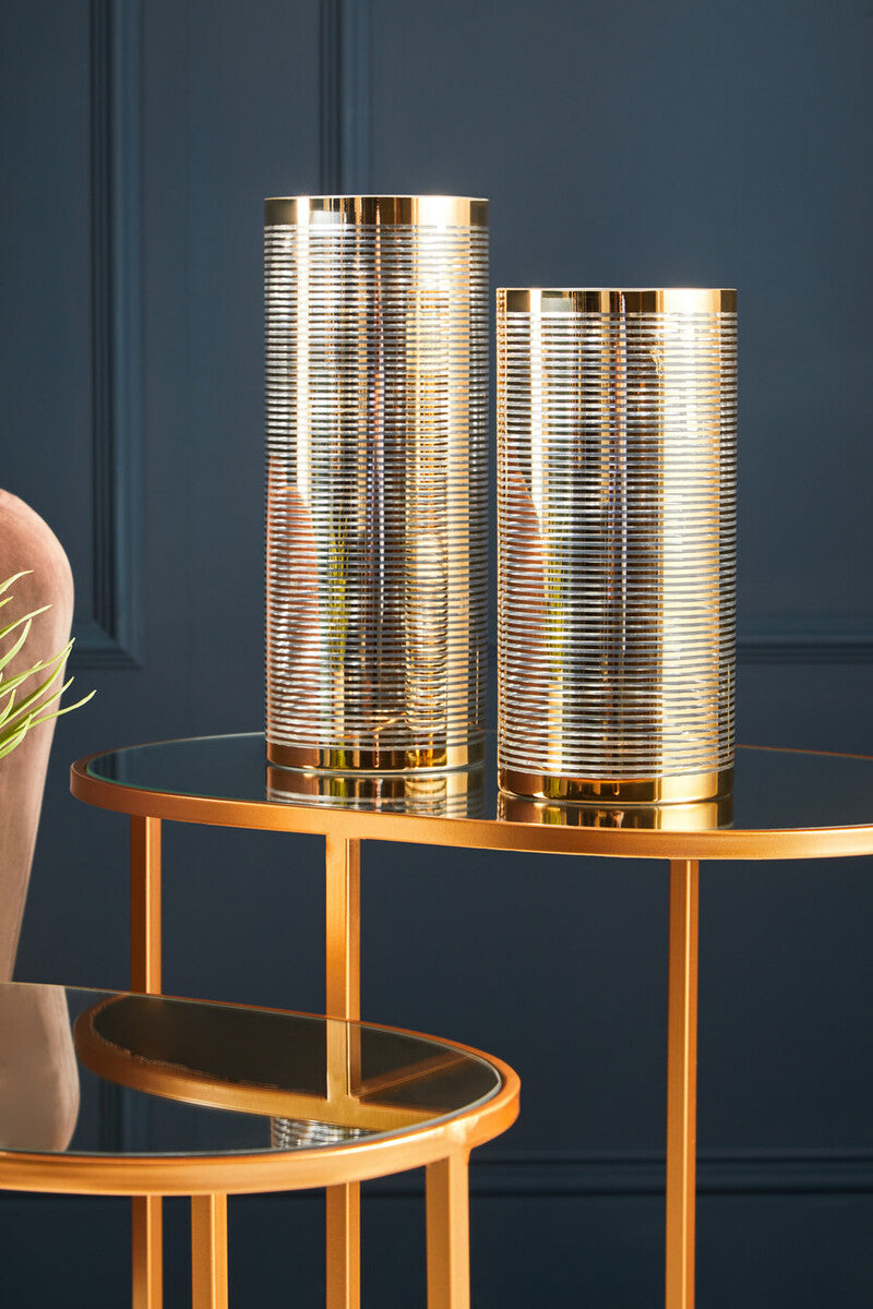 Soft curves, strong style the Avantis Gold Finish Set Of 2 Oval Side Tables introduces gold oval frames topped with gleaming mirrored glass. The oval form adds gentle movement that contrasts beautifully with linear sofas and angular armchairs, while the reflective tops brighten corners and show off your favourite decor pieces.