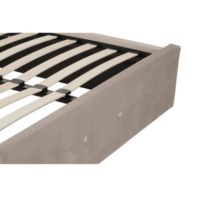 Indulge in soft glamour with the Edison Mink Velvet Ottoman Double Bed. This double ottoman bed features a rolled, wingback-style headboard with diamond tufting for an elevated profile. Enjoy generous hidden storage and a rich mink tone that warms any modern interior.