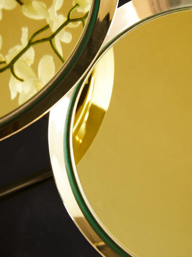 Its gleaming gold finish frames two staggered tabletops, creating an eye-catching tiered silhouette that is perfect for styling books, a statement lamp, or your favorite decorative objects.