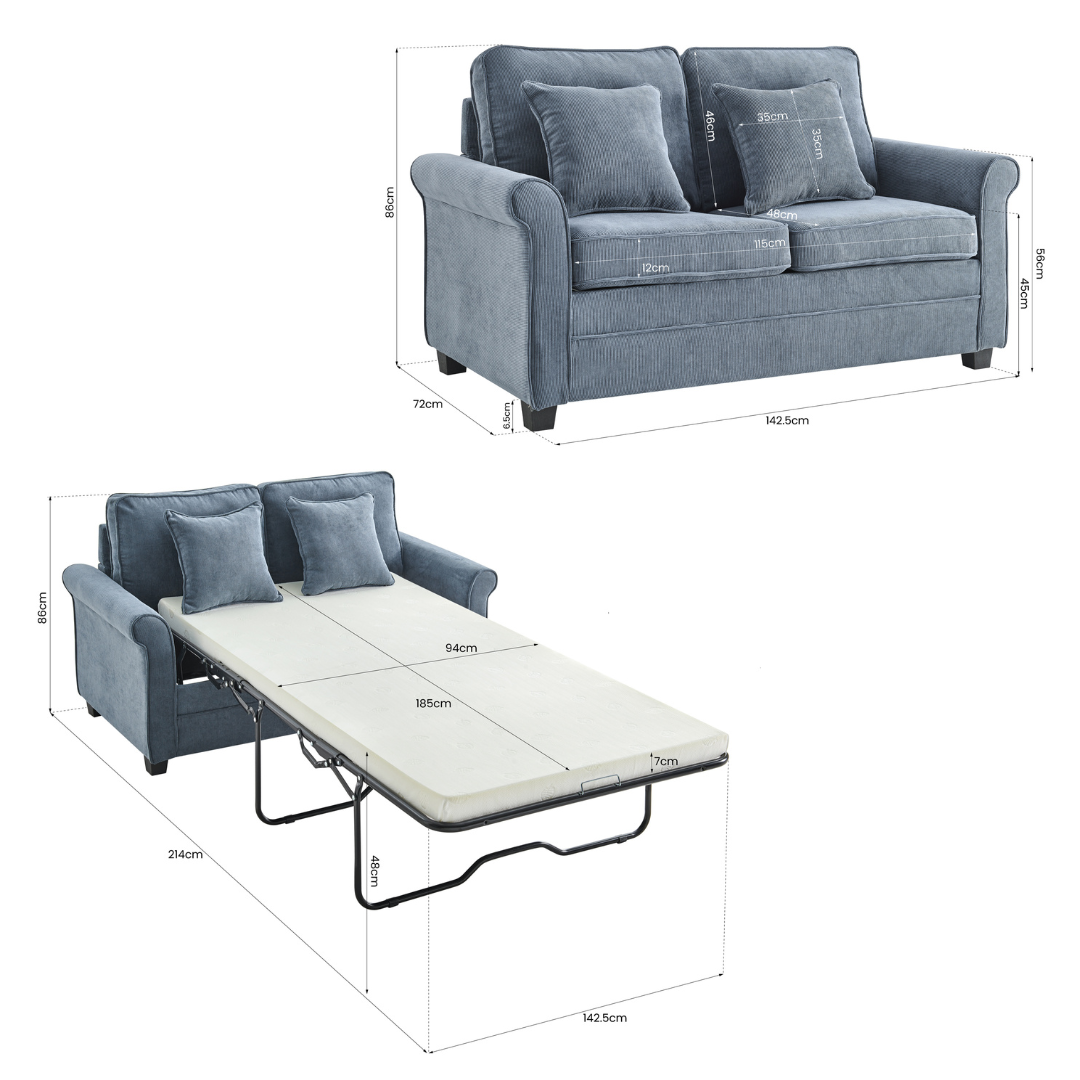 Transform your living space with our sophisticated Ramy 2-seater sofa bed. Featuring premium blue corduroy upholstery and a pull-out memory foam mattress, this versatile piece combines contemporary design with exceptional comfort.