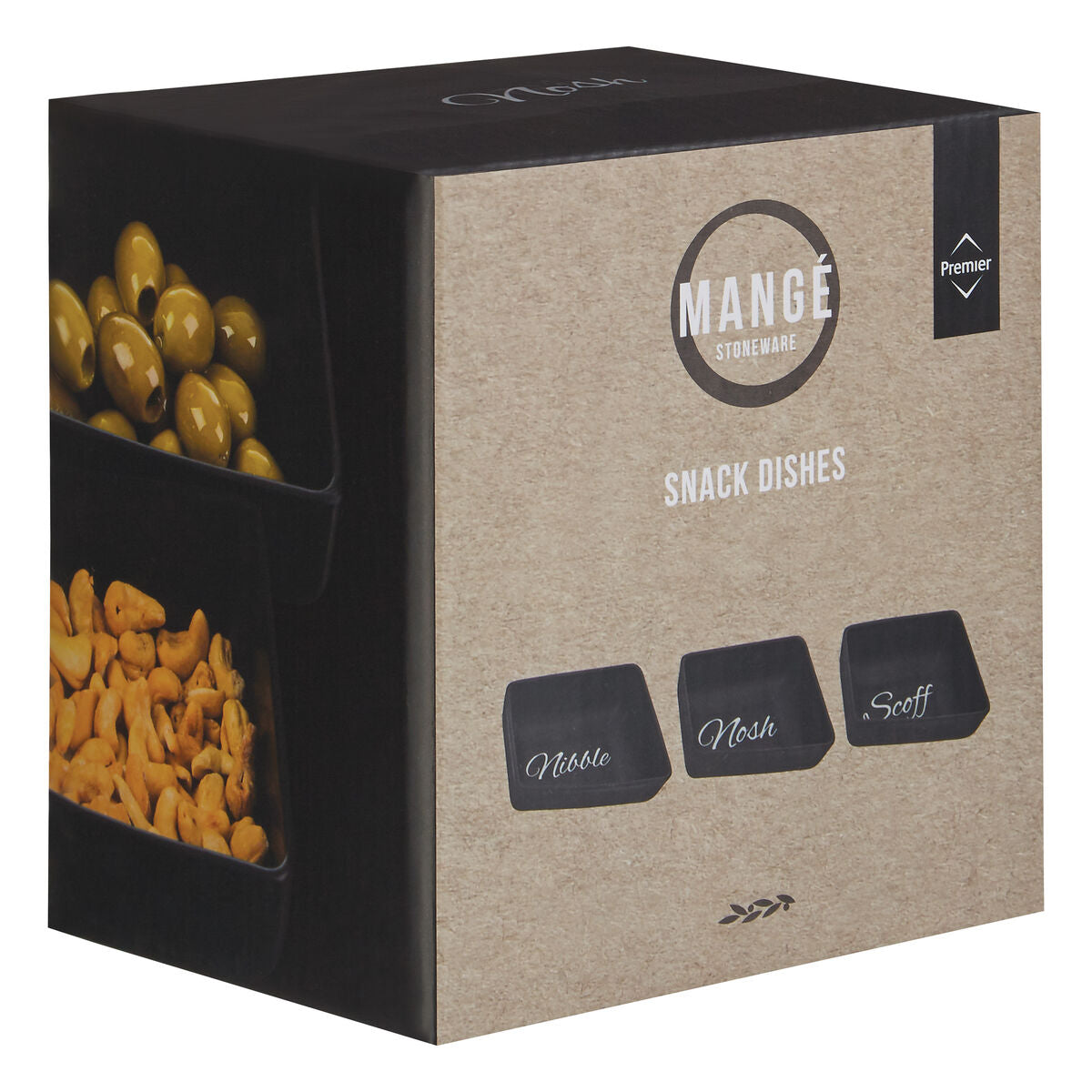 Elevate casual nibbles with the Set Of Three Mange Snack Dishes in matte black. Each dish features playful centre text reading nibble, nosh, or scoff, bringing personality to popcorn, nuts, and sweet treats. The trio offers flexible serving for movie nights, parties, and everyday grazing.