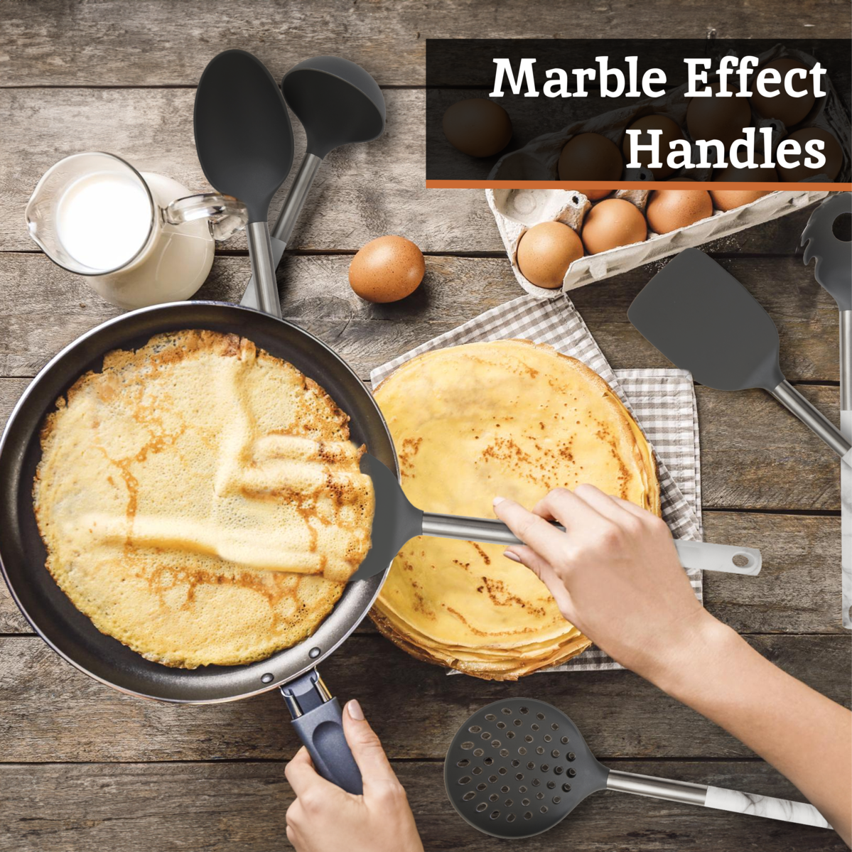 The tools feature slim handles in a marble-effect finish that wipes clean easily. Working ends are shaped for everyday tasks, offering smooth contact while you cook and serve.