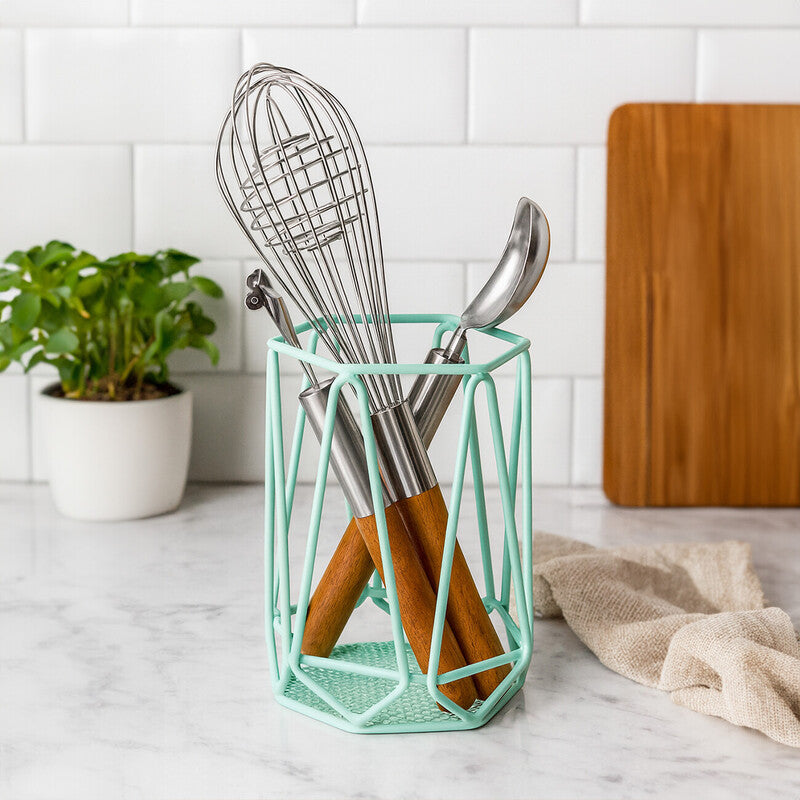 Keep your most used tools within reach with the Vertex Green Finish Utensil Holder from Orsina. The hexagonal frame and kite-patterned sides create a modern, airy container for spoons and spatulas. A fresh green tone adds a lively accent beside the hob or on a prep island.